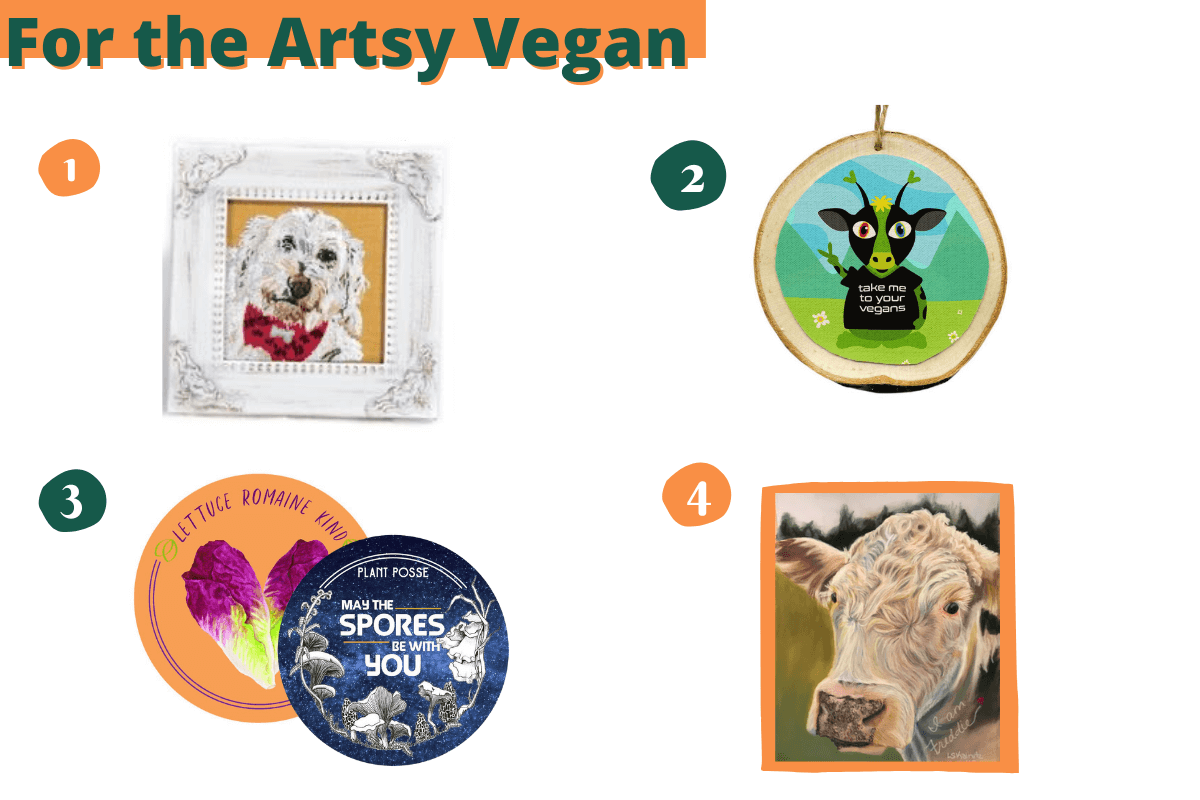 4. Studio Lyn – We love this painting of Freddie who is enjoying the rest of his days at Skylands Sanctuary in New Jersey. This piece along with many others can be found at Studio Lyn as well as the option to have custom Pet Portraits created and more! A perfect gift for the Animal Loving Artsy Vegan in your life!