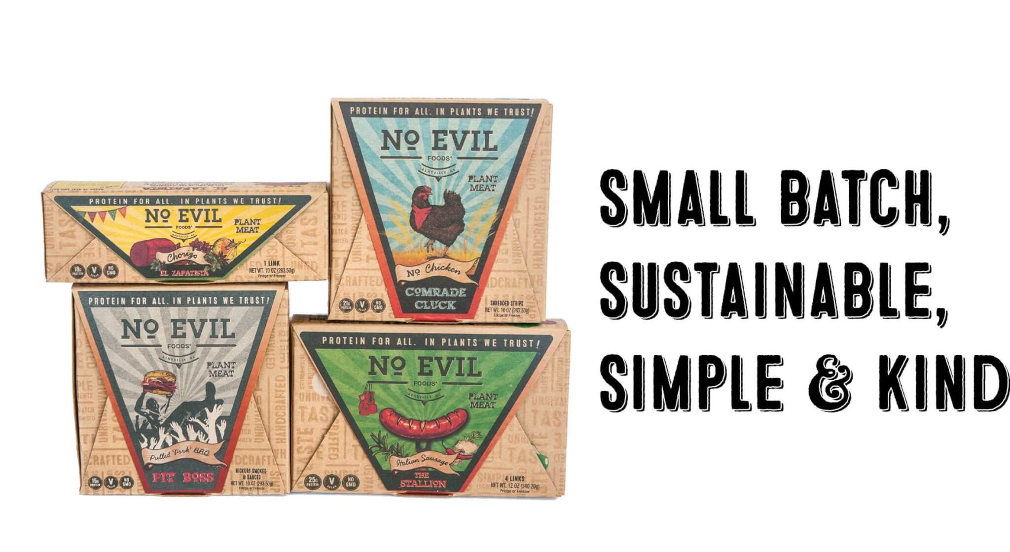 No Evil Foods creates locally handcrafted plant meats with in your face flavor & 'I can't believe it's not meat' texture. We're committed to making the best plant meats on the market using organic ingredients, and always created with sustainability in mind.Come see us at 'L'Vegettoir', our Vegan Butcher Shop Farm StandTuesday: West Asheville Tailgate 3:30-6:30pmWednesday: Montford Tailgate Market 2-6pmSaturday: Asheville City Market 8am-1pmNorth Asheville Tailgate Market 8am-Noon