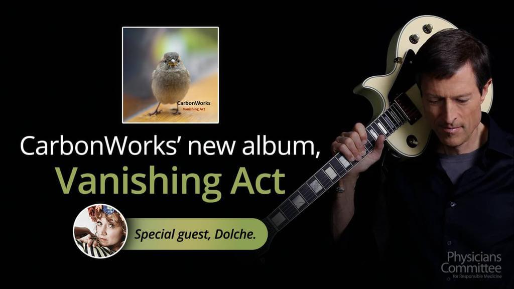 On this special evening (Tuesday, May 9), music comes together with PCRM’s work to save animals. Dr. Neal Barnard will present music and videos from his band CarbonWork’s new album, called *Vanishing Act*. The evening will also feature a live performance by Italian-French singer Dolche, whose voice has graced both CarbonWorks albums. There will also be a vegan cupcake reception. Records and CDs will be available to purchase with proceeds benefitting PCRM.