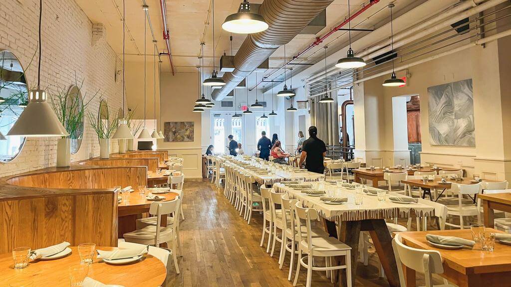 Leanne H – “Wow!! The biggest vegan restaurant in NYC, and SO pretty. we now have the perfect spot for celebrating – birthdays, weddings, events, reunions. Came three times in one week! Favorites: sausage flatbread, THE APPLE SANDWICH (I know it sounds so unassuming but I promise you it hits all the spots like a cartwheel of flavors!) cheese plate (with locally made Rind Cheese), risotto, and the chocolate bark! Also the non alcoholic spritzers are so good.”